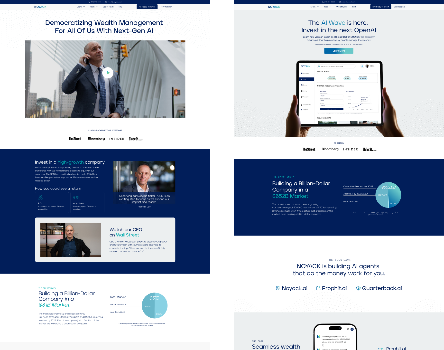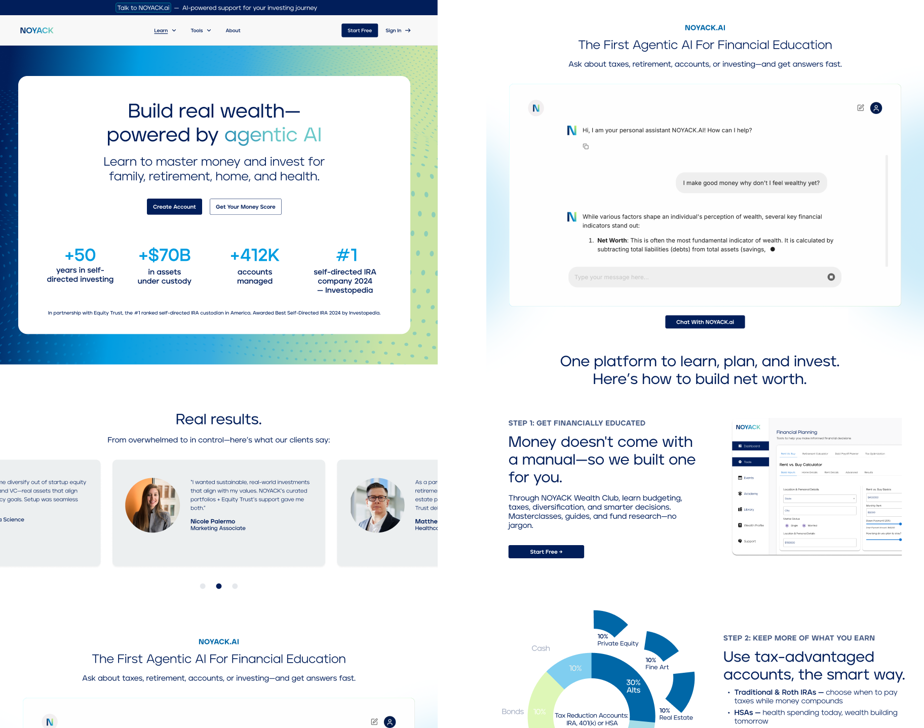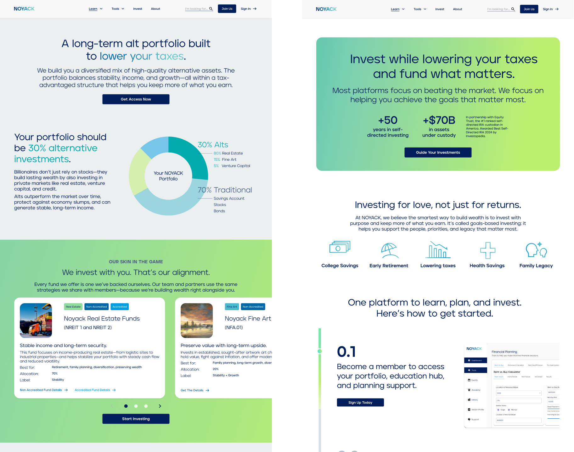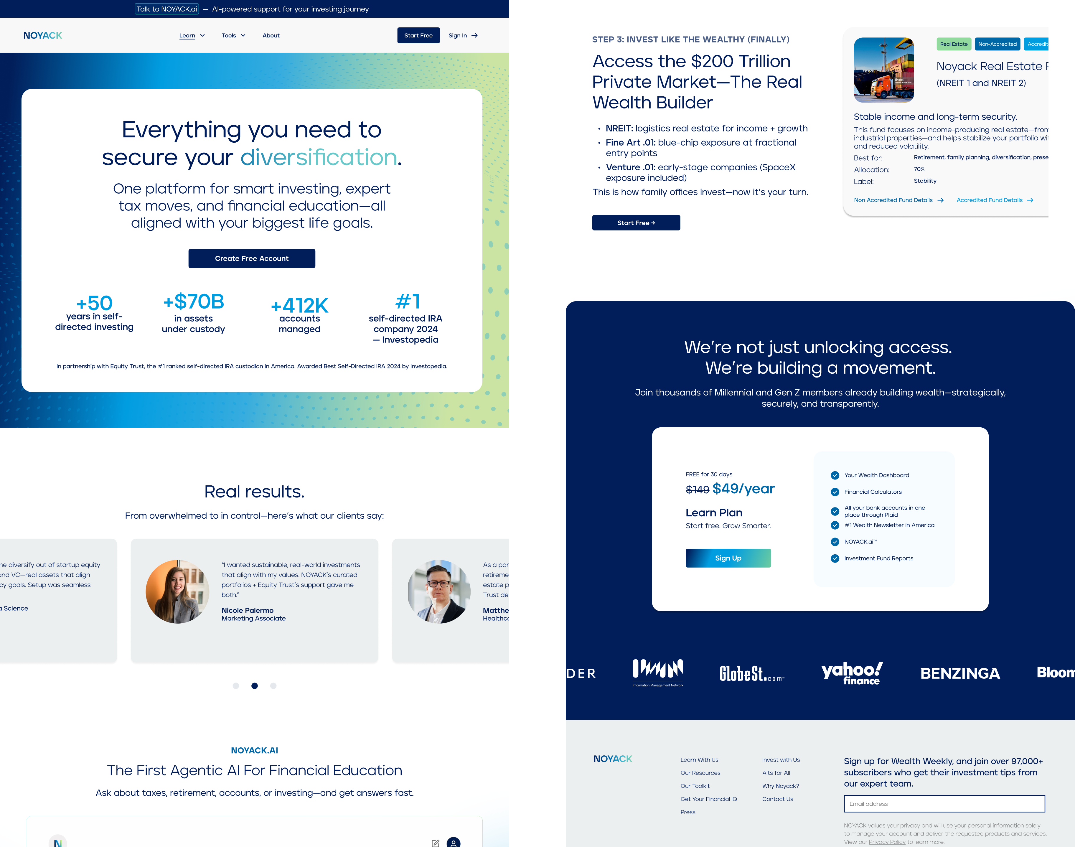 NOYACK is a fintech platform that helps users invest in diversified alternative portfolios. The experience is education-led: users first learn about wealth-building strategies before exploring curated portfolio opportunities and moving into the investment platform.