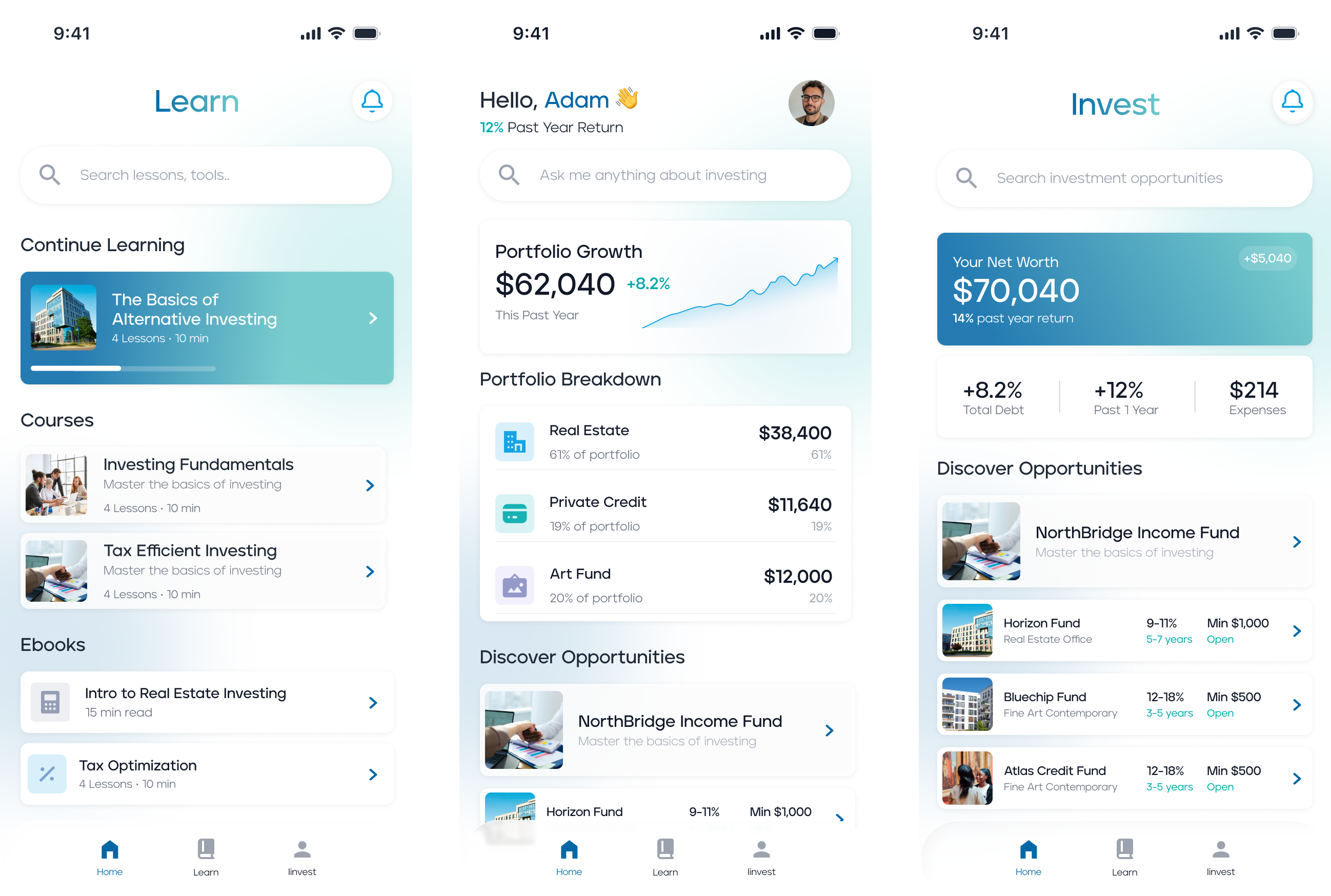 The experience was broken up into three parts so each screen has a job. Home is about quickly understanding where you stand—no digging, no guesswork. Learn shifts things into a more structured flow, so you’re not just given tools, but a way to actually build confidence.Invest is where that confidence turns into action, with a smaller set of opportunities that are easier to evaluate instead of overwhelming.The goal wasn’t to add more features, but to make each step feel obvious.